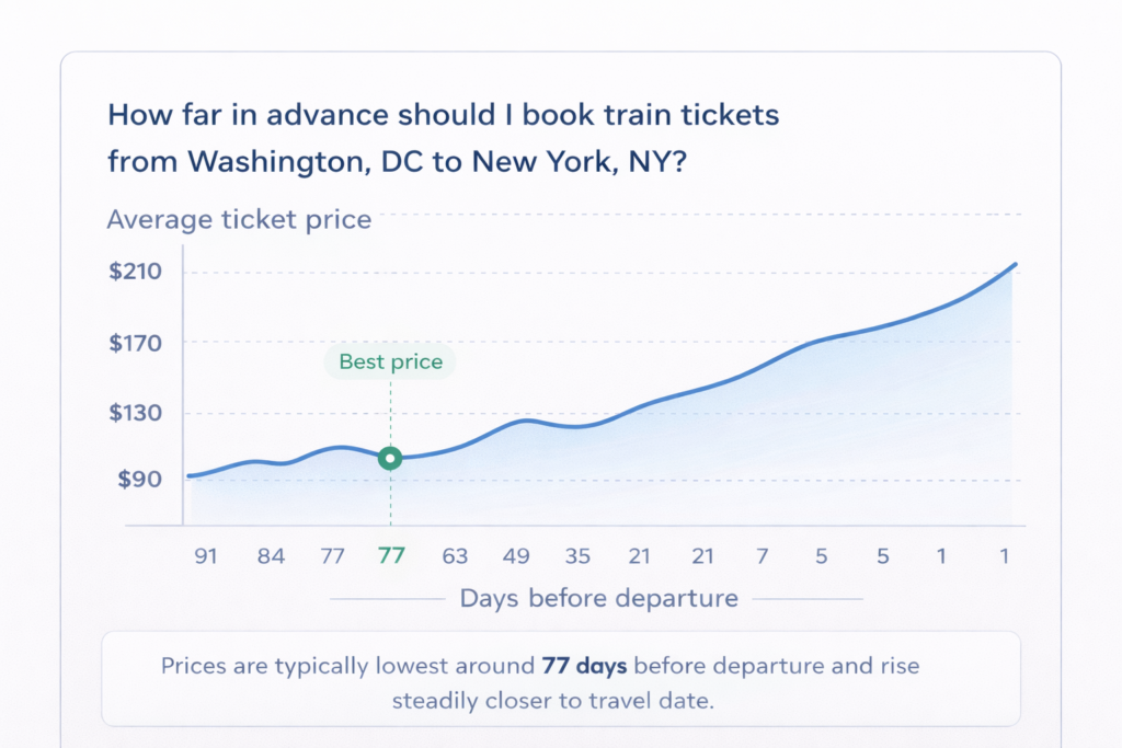 Competitor sources recommend booking as early as possible, ideally 77 days in advance, when fares are at their lowest. Avoiding peak travel times—Friday evenings, Sunday afternoons, and holidays—can also help you find cheaper tickets. Using platforms like Amtrak, Rail Ninja, or Omio allows you to compare prices instantly.